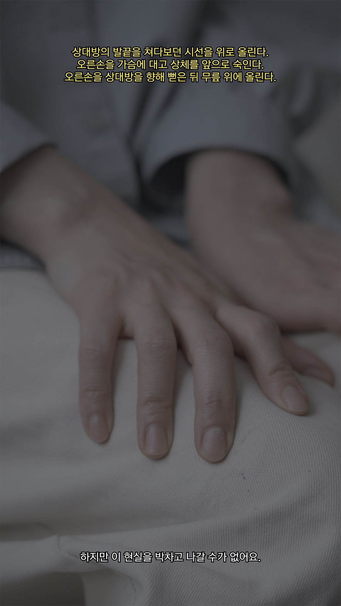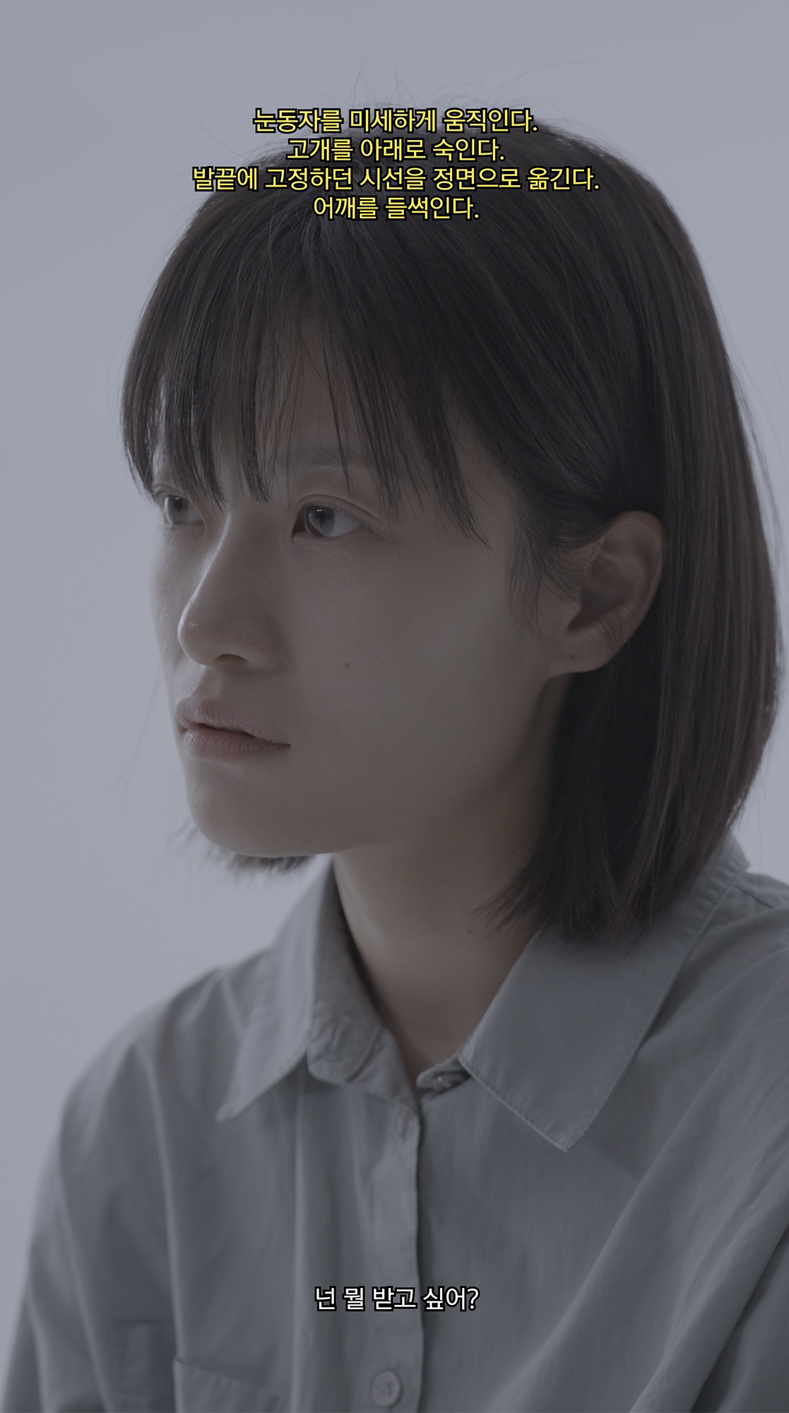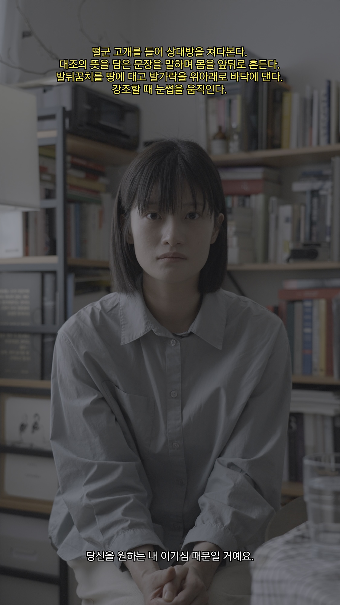 그들을 마주했을 때 가장 먼저 전신을 담은 장면을 촬영했다. 동시에 액정 속 인물과 현실의 인물을 번갈아 바라보며 눈, 코, 입, 주름 짓는 미간과 손짓, 발짓을 쫓기 시작했다. 더 가까이 다가가며 그들의 미세한 행동과 변화를 담아냈다. 이 장면들을 반복해서 재생하며 느낀 것은 구체적인 메시지를 담은 언어를 비워내고도 이 몸짓이 무엇을 향하는지 가늠할 수 있다는 확신이었다. 그리고 오늘날, 이 몸짓은 때로는 가로막히고 비워지며 왜곡되기도 한다는 걸 끊임없이 상기할 수밖에 없었다.
