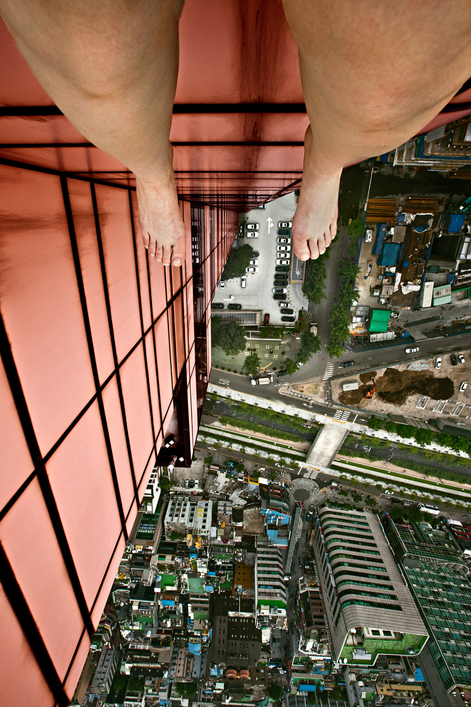 Self-Portrait은 현실과 환상의 경계에 선, 사진으로 환원되기 위한 관객 부재의, 사진으로만 환원될 수 있는 퍼포먼스다. Self-Portrait 시리즈는 눈앞에 ‘펼쳐진’ 풍경은 일종의 환상이라는 발상에서 출발한다. 나는 도시의 고층 건물이나 절벽의 경계에 놓인 스스로의 모습을 사진에 담는다. 연사 모드의 셀프타이머를 설치한 채 초당 수 장의 사진을 찍으며 메모리카드가 다 찰 때까지 경계에서 균형을 잡고자 움직이는 내 몸을 담고, 그 후 의식처럼 내가 머물렀던 발아래를 찍는다. 고층 건물이나 전망대에서 사람들은 도시의 풍경이 자신의 눈앞에 펼쳐져 있다고 생각한다. 하지만 그 경계에 다가서서 아래를 내려다보면 사람들은 아찔함, 혹은 고소공포증을 느낀다. 바로 이 아찔함이 시각적 인지가 공간적 인지 속으로 붕괴하는 순간이다. 때문에 내 사진 속의 경계는 두 가지의 인지적 방식이 충돌하는 경계이자 환상과 현실 사이를 상징하는 심리적 경계이기도 하다. 그 어떠한 간극에 서있건, 경계에 위치한 인간의 몸과 정신은 한없이 유약하다. 정신은 그 경계 너머로 날고자 하나 두려운 몸은 현실을 붙잡는다. 이것이 현실 속의 문맥이다. 그리고 연사 모드의 사진들은 이러한 콘텍스트를 오롯이 담는다. 때문에 썸네일로 본 문맥은 경계에서 균형을 잡으려는 나의 느리고 미약한 움직임이다. 내 모습을 지켜보는 타인이 인지하는 나의 모습도 이와 크게 다르지 않다. 하지만 이상하게도 그중 단 한장은 문맥과 전혀 다른 말을 하고 있다. 내가 상상하는, 그 경계의 위험 속에서도 불구하고 환경에 녹아든 평온함, 혹은 눈앞의 경계 너머로 몸을 던질듯한, 나 자신도 인지하지 못한 나의 모습을 수많은 사진 중 단 한장은 말하고 있다. 이렇게 스스로도 인지하지 못하는 생의 아주 짧은 한순간만은 현실이 아닌 환상, 그리고 꿈꾸는 것, 욕망하는 것이 현실로 드러날 수 있다고. 그리고 사진은 그것을 마치 전부인 듯 담아 환상을 현실로 가져올 수 있다고 믿는다. 때문에 나에게 사진은 진실이자 거짓이며, 현실이자 환상이다.