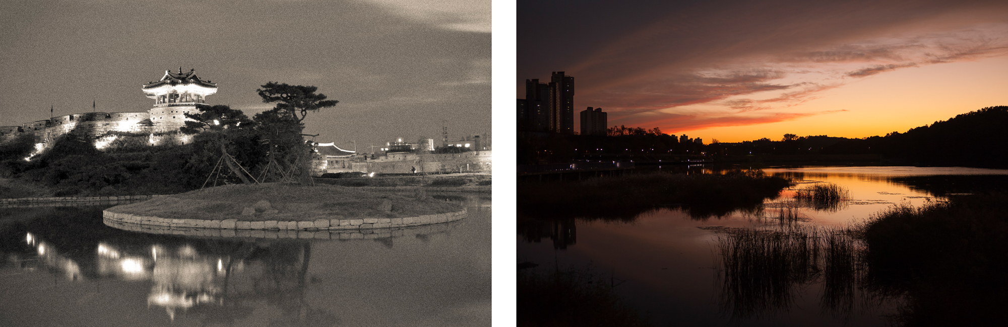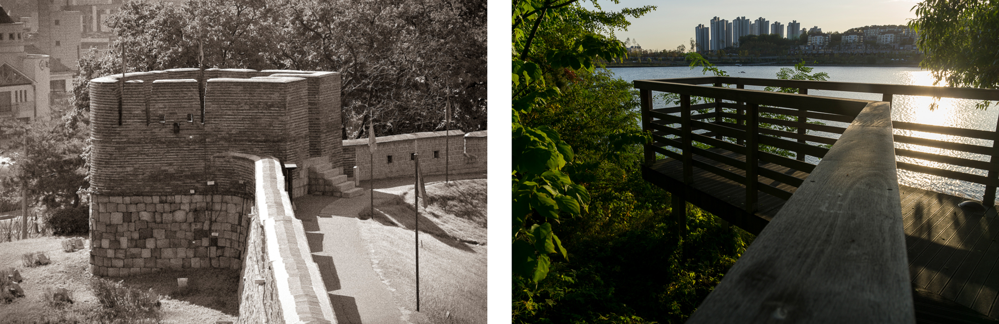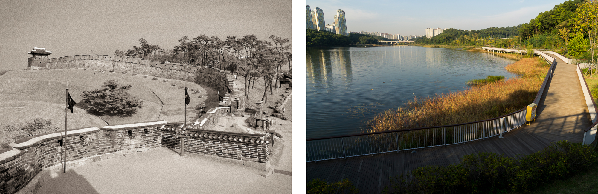 219년 동안 한 도시의 아이콘 역할을 도맡아온 수원 화성에 대구(對句)가 하나 생겼으니 이제 갓 두 돌이 된 광교호수공원이다. 유네스코 세계문화유산이라는 드높은 지위에 비할 바 아닐지나 그 역시 주민들의 사랑에 더해 2014 대한민국 경관대상이라는 견장까지 달았다. 여기에 연원이라 할 원천저수지와 신대저수지가 1929년 조성 이후 지역의 대표적인 유원지로 꼽혀왔다는 전사(前史)까지 들추어본다면 둘 사이의 비교가 그리 무리만도 아닐 것이다. 뒷받침이 되어줄 만한 시각체험도 매일같이 펼쳐진다. 판이한 배경과 성격 따위 아랑곳없이 ‘트랙’을 돌기 바쁜 이용객들의 모습을 번갈아 지켜보다 나는 좀 더 적극적으로 둘을 짝지어줘야겠다고 마음먹게 되었던 것이다. 그것은 짐짓 넌지시 던져보는 물음인 동시에 꼬깃꼬깃한 사연들로 덧댄 개인적 헌정이기도 했다.