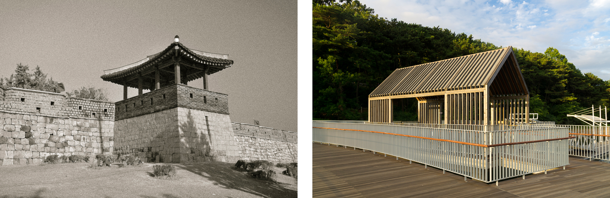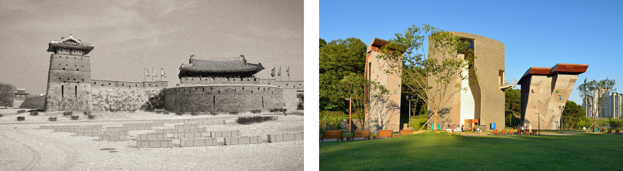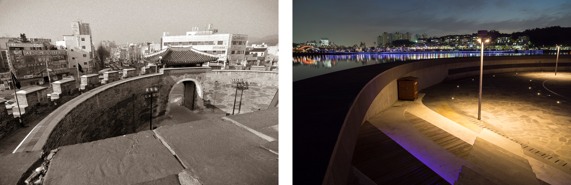 219년 동안 한 도시의 아이콘 역할을 도맡아온 수원 화성에 대구(對句)가 하나 생겼으니 이제 갓 두 돌이 된 광교호수공원이다. 유네스코 세계문화유산이라는 드높은 지위에 비할 바 아닐지나 그 역시 주민들의 사랑에 더해 2014 대한민국 경관대상이라는 견장까지 달았다. 여기에 연원이라 할 원천저수지와 신대저수지가 1929년 조성 이후 지역의 대표적인 유원지로 꼽혀왔다는 전사(前史)까지 들추어본다면 둘 사이의 비교가 그리 무리만도 아닐 것이다. 뒷받침이 되어줄 만한 시각체험도 매일같이 펼쳐진다. 판이한 배경과 성격 따위 아랑곳없이 ‘트랙’을 돌기 바쁜 이용객들의 모습을 번갈아 지켜보다 나는 좀 더 적극적으로 둘을 짝지어줘야겠다고 마음먹게 되었던 것이다. 그것은 짐짓 넌지시 던져보는 물음인 동시에 꼬깃꼬깃한 사연들로 덧댄 개인적 헌정이기도 했다.