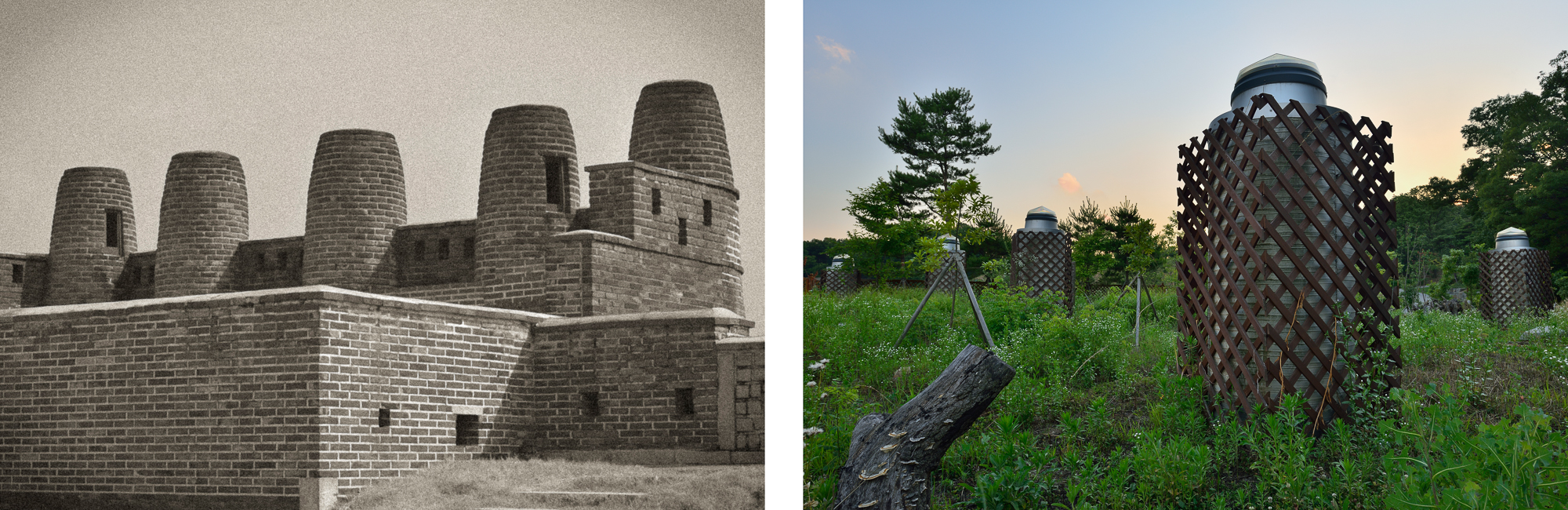 두 이미지의 재현 방법을 최대한 달리 한 이유도 여기에 있다. 하나는 낡고 오래된 역사유적으로, 또 하나는 갓 지어진 신도시의 조경시설로 여기기 쉽지만 둘 다 속살은 물론 겉옷조차 그리 얇은 홑겹이 아니다. 따라서 이것은 기꺼이 패자가 되기를 자처하는, 그래야만 목적이 달성되는 너스레 섞인 게임으로의 초대다. 두 공간의 교합지점을 보다 적극적으로 환기시키고자 나는 역설의 시각언어를 택했다.