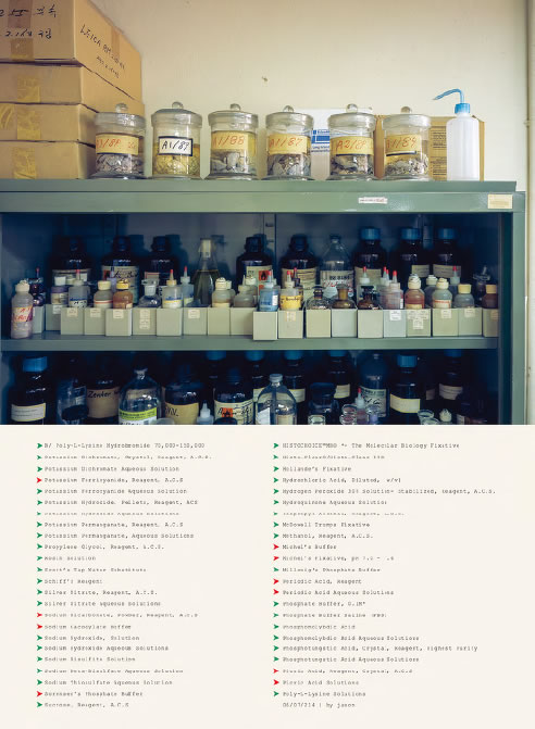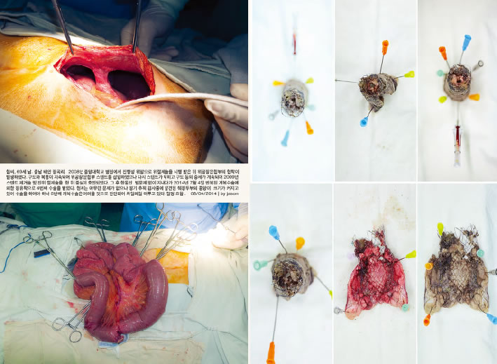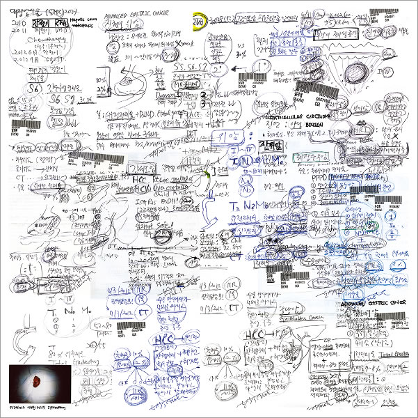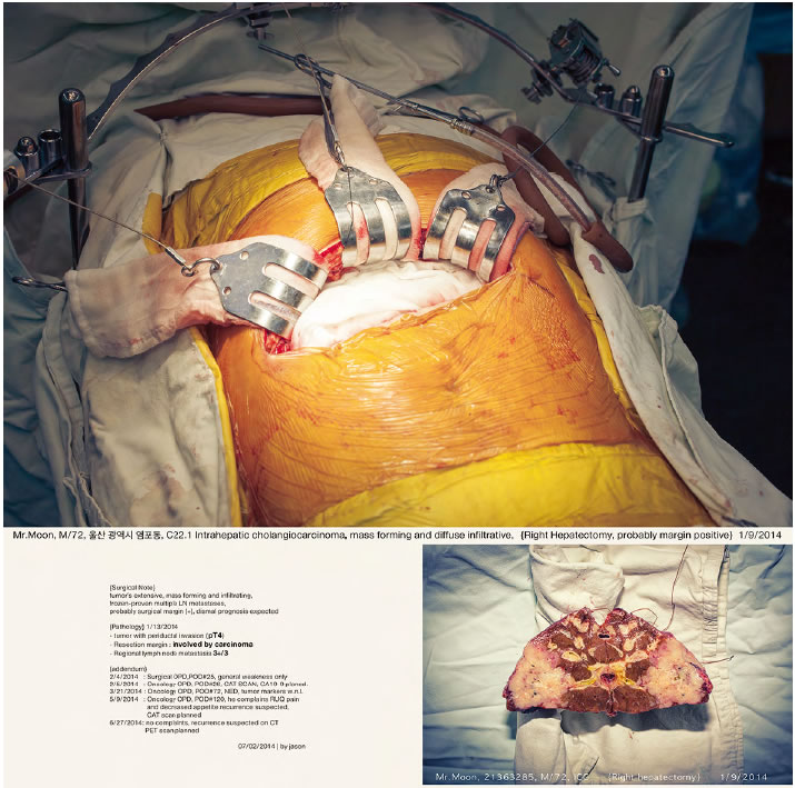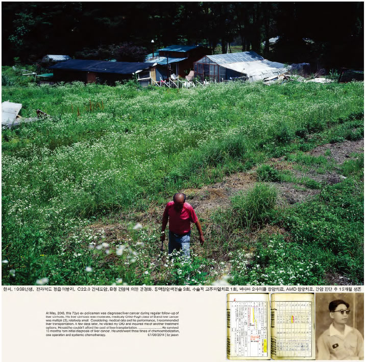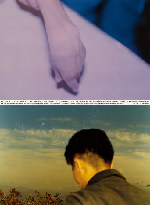 이 작업에 등장하는 환자들은 존재하며, 실제로 내가 만난 이들이다. 부디 그들의 신원과 영역을 존중해주시기를 바란다. 2005년 한 해 동안 국내에서만 7만 명이 ‘암’으로 사망하였다. 이런 비극적인 지표 이에서 연작 가 시작되었다. 이 연작은 ‘암’이라는 것을 매개로 하여 만나게 되는 의사, 연구자, 환자 및 주변인들의 그칠 줄 모르는 투쟁, 환상, 희망, 절망, 죽음과 생존에 대한 작업이며, ‘암’이라는 불멸의 질병의 내면으로 들어가서 성격을 이해하고, 그 행동의 수수께끼를 풀어내려는 시도이다. 나는 연작을 의학논문의 형식과 같이 ‘도입’, ‘재료와 방법’, ‘결과’, ‘결론’, ‘토의’ 다섯 부분으로 나누고 이중 첫 세 부분을 각각의 부제를 달아 발표했다. 첫 ‘도입’ 단계인 연작에서는 병동 내부 시설과 사물 등에 집중해 환자가 입원하여 수술하고 퇴원하기까지의 경로를 추적했다. 이후 ‘재료와 방법’, ‘결과’로 를 발표했는데, 이는 환자 개인 사진과 임상 차트, 중환자실 간호일지, 생애 마지막 생체징후곡선 등을 포함한 의학 다큐멘트와 수술 후 환자의 생존과 사망 때까지 과정을 아카이브의 형식으로 구성한 것이다. {블로그: 외과일기}는 논문형식으로 진행되어온 연작에서 파생된 것으로 홈페이지에 일기 형식으로 기록해나간 임상일지를 재구성한 것이다.